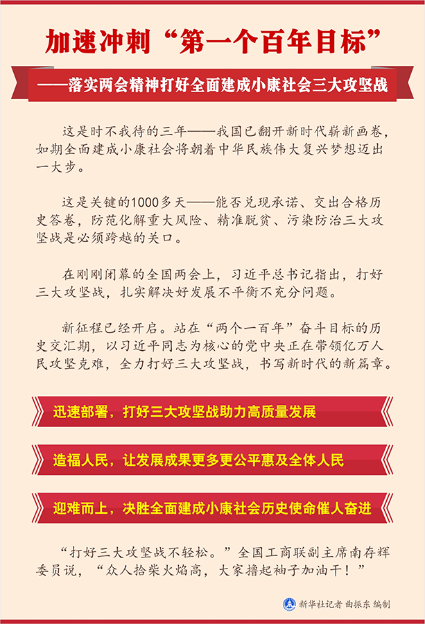 新華社北京3月29日電? 題:加速沖刺“第一個百年目標(biāo)”——落實兩會精神打好全面建成小康社會三大攻堅戰(zhàn)