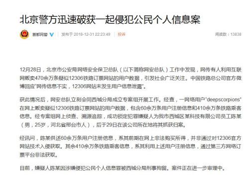 據(jù)北京市公安局網(wǎng)絡(luò)安全保衛(wèi)總隊微博消息,北京警方破獲一起侵犯公民個人信息案,網(wǎng)上販賣470余萬條疑似12306鐵路訂票網(wǎng)站用戶數(shù)據(jù)的犯罪嫌疑人陳某,已被刑拘。