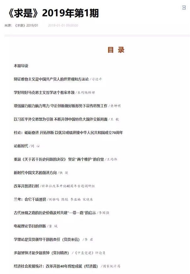中共中央機(jī)關(guān)刊《求是》雜志從2019年1月1日出版的第1期起全新改版。這是黨中央進(jìn)一步加強(qiáng)全黨思想理論建設(shè),堅(jiān)持用習(xí)近平新時(shí)代中國(guó)特色社會(huì)主義思想武裝全黨、教育人民、指導(dǎo)實(shí)踐的重大舉措,體現(xiàn)了以習(xí)近平同志為核心的黨中央,對(duì)發(fā)揮好黨中央主辦的理論刊物指導(dǎo)全黨全國(guó)工作重要思想理論陣地作用的高度重視。