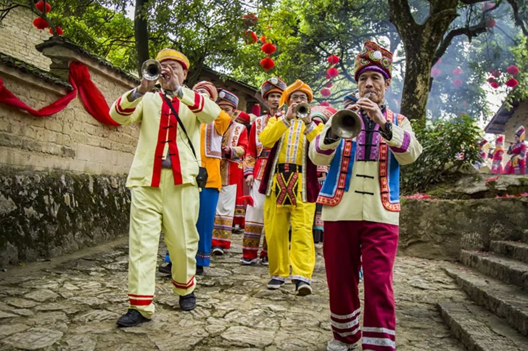2018-12-29,廣西宜州流河寨。壯鄉(xiāng)傳統(tǒng)婚禮里的吹嗩吶。作者:藍景惠