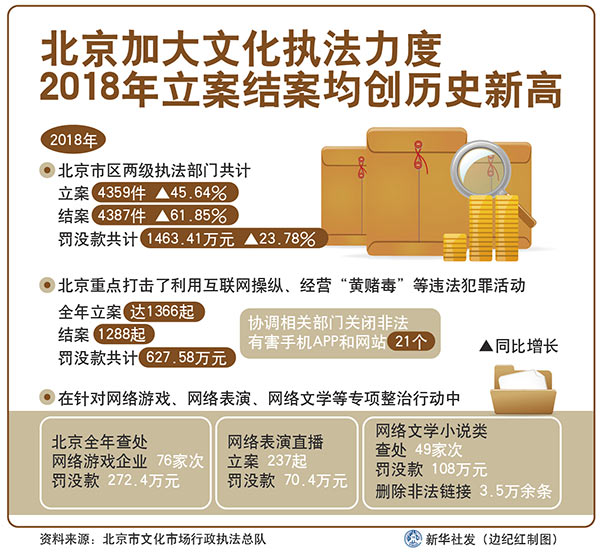 圖表:北京加大文化執(zhí)法力度 2018年立案結(jié)案均創(chuàng)歷史新高 新華社發(fā) 邊紀紅 制圖