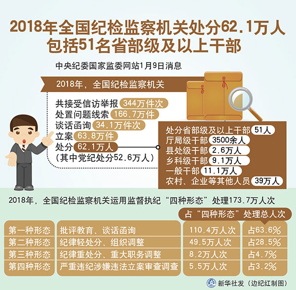 圖表:2018年全國(guó)紀(jì)檢監(jiān)察機(jī)關(guān)處分62.1萬(wàn)人 包括51名省部級(jí)及以上干部 新華社發(fā) 邊紀(jì)紅 制圖