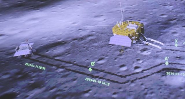 1月11日,在北京航天飛行控制中心大屏幕上拍攝的著陸器(右)和巡視器互拍畫面。新華社記者 金立旺 攝