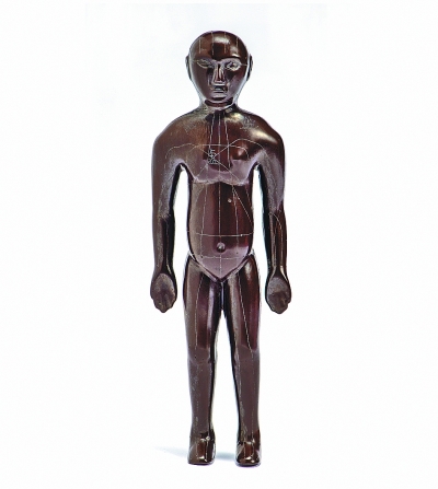 經(jīng)脈腧穴理論是中醫(yī)理論體系的重要組成部分,是針灸學(xué)術(shù)和臨床實踐的核心理論。腧穴最早的記載形式為文字,而后有繪圖,最后才有模型。目前已知有關(guān)經(jīng)脈的記載最早見于馬王堆漢墓出土的帛書,但僅有文字資料,缺少直觀形象的人體經(jīng)穴圖或?qū)嵨镒鳛檠芯繀⒄瘴?,一些?jīng)脈的具體走向和腧穴的準(zhǔn)確位置難以明確。1993年,四川綿陽雙包山漢墓出土的針灸漆人,打破了實物資料缺乏的困境,但該人像僅有經(jīng)脈循行,并無腧穴標(biāo)識,且保存不完整,可考證的信息相對不全?!疤旎蒯t(yī)簡”及經(jīng)穴漆人像的出土,再次為早期經(jīng)脈腧穴理論的研究提供了客觀的文字資料和形象的醫(yī)學(xué)模型。