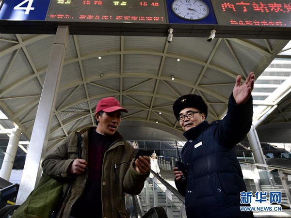 1月16日,李誠(chéng)在西寧站巡查是否有旅客誤乘。新華社發(fā)(張龍 攝)