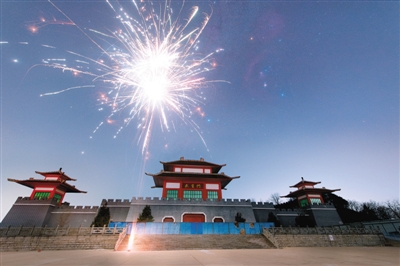 在山東省濟(jì)南市武圣門,新年的煙花和“福祿壽”三星共同綻放在夜空。襲清攝