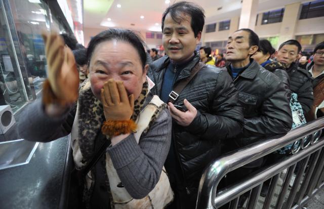 2013年,長(zhǎng)沙火車站售票窗口前,工作人員告知一位女士當(dāng)年2月14號(hào)長(zhǎng)沙至廣州的臥鋪還有余票后,這位女士難掩喜悅。(新華社記者 李尕 攝)