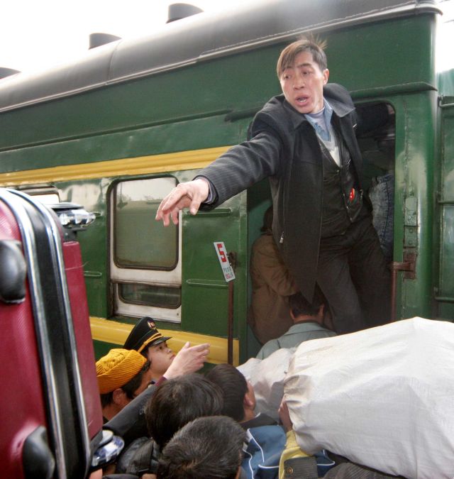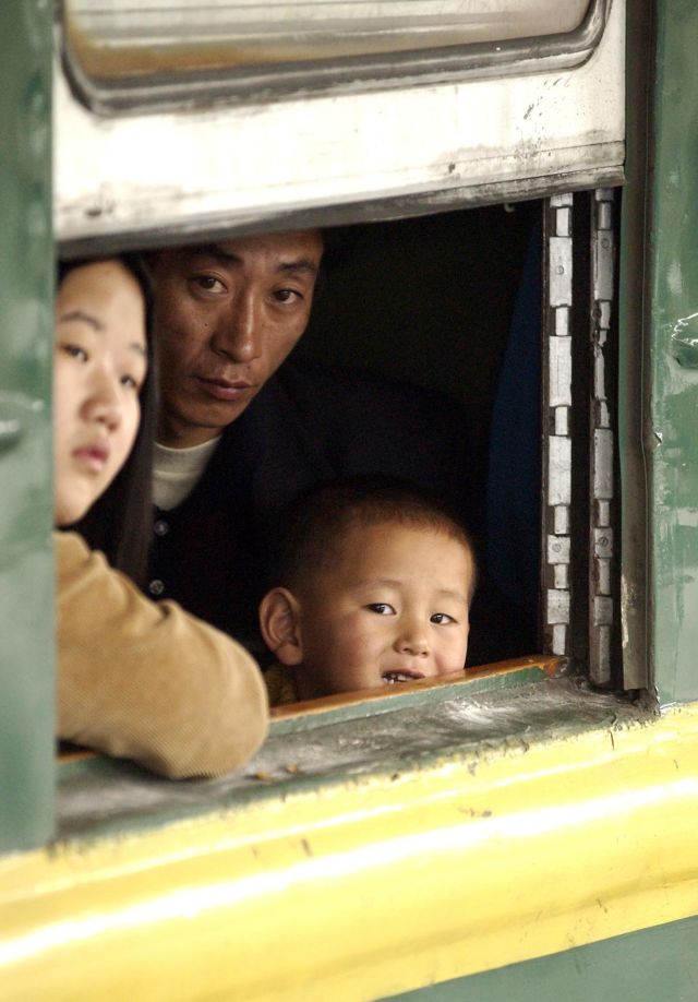 2004年,在廣州火車站登上返鄉(xiāng)列車的乘客通過(guò)車窗向外張望。