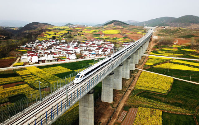 2018年3月21日,一列動(dòng)車組列車行駛在西成高鐵陜西漢中洋縣段。新華社發(fā)(唐振江 攝)
