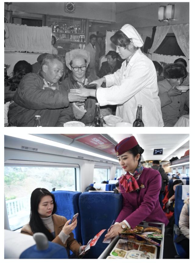 上圖:1982年,榮獲鐵道部流動(dòng)優(yōu)勝紅旗的呼和浩特至北京89/90次列車,在春運(yùn)期間熱情為旅客服務(wù)。(新華社記者 白斯古郎 攝);下圖:2018年春運(yùn)期間,乘客在重慶至成都G8510次列車上用手機(jī)支付購(gòu)買小吃。(新華社記者 王全超 攝)