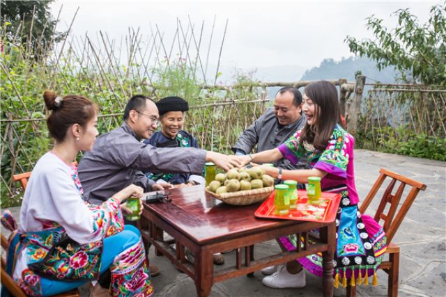 在湖南省湘西土家族苗族自治州花垣縣雙龍鎮(zhèn)十八洞村,村民邀請遠方的客人品嘗湘西特產獼猴桃和獼猴桃果汁飲料。(新華社記者王天聰攝·2017年)