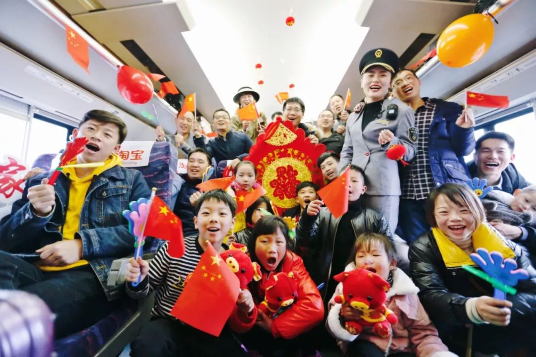 2019-02-03,江西省南昌市。D6503次列車上,列車乘務(wù)人員為了讓旅客返鄉(xiāng)旅程體驗(yàn)更美好,精心布置車廂,為旅客派發(fā)福袋、糖果并合影留念。作者:嗯叮
