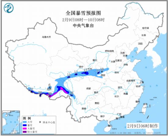 中央氣象臺(tái)2月9日06時(shí)繼續(xù)發(fā)布暴雪預(yù)報(bào)。預(yù)計(jì),9日08時(shí)至10日08時(shí),陜西中部、甘肅東部、青海東部和南部、西藏東部和南部、山西西南部等地的部分地區(qū)有大到暴雪,其中,西藏南部和東部的局部地區(qū)有大暴雪或特大暴雪(見圖1)。