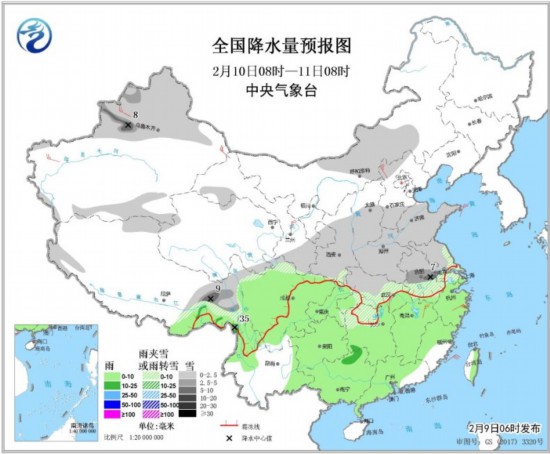 圖2 全國(guó)降水量預(yù)報(bào)圖(2月9日08時(shí)-10日08時(shí))