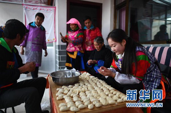 2月4日,松德村五社村民李玉花(右一)和家人一同包餃子。當日是除夕,青海省海東市互助土族自治縣丹麻鎮(zhèn)松德村五社的40戶村民在新居中喜迎新春。2018年,這40戶村民通過易地扶貧搬遷政策住進新房并順利實現(xiàn)脫貧。 新華社記者 張宏祥 攝