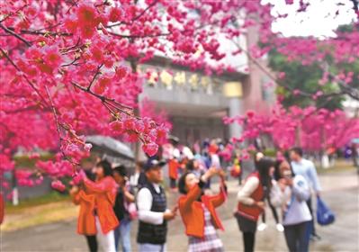 華南農(nóng)業(yè)大學(xué)內(nèi)的櫻花盛開,引來不少市民賞花拍花。記者廖雪明 攝
