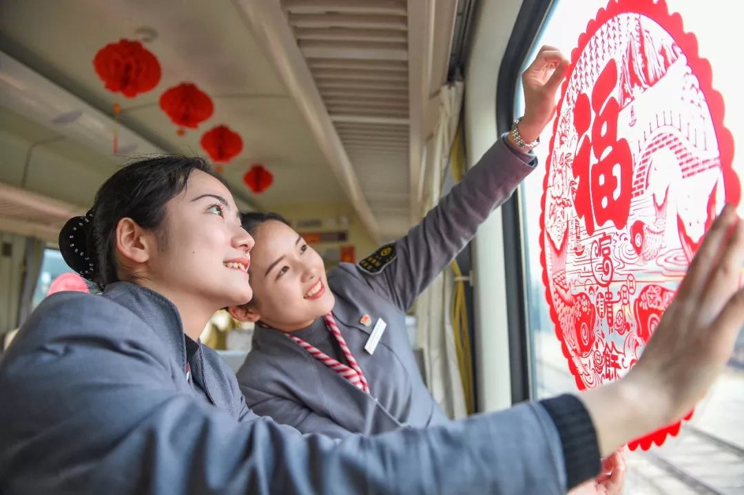 2019-01-29,江西省南昌市。南昌至北京西的Z68次列車(chē)上,乘務(wù)員在車(chē)上貼上窗花,為旅客準(zhǔn)備免費(fèi)書(shū)籍、玩具和春節(jié)物品等,營(yíng)造濃濃的年味兒。作者:清風(fēng)吹過(guò)60年