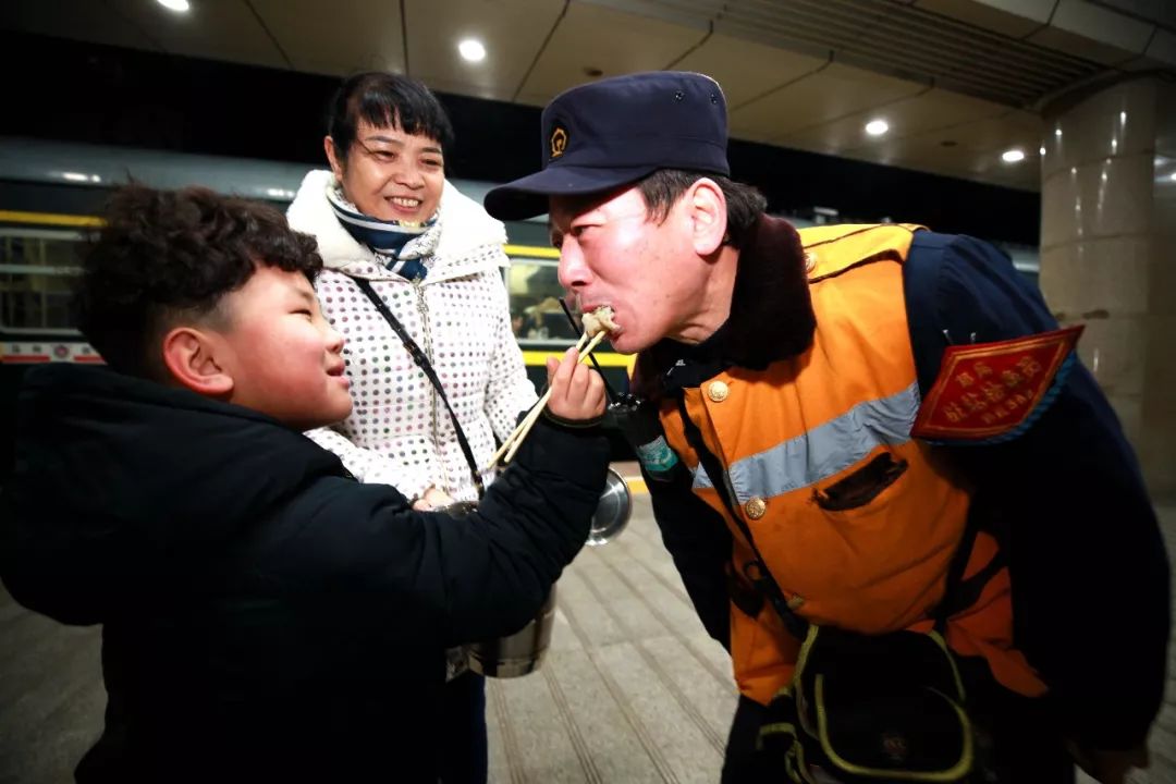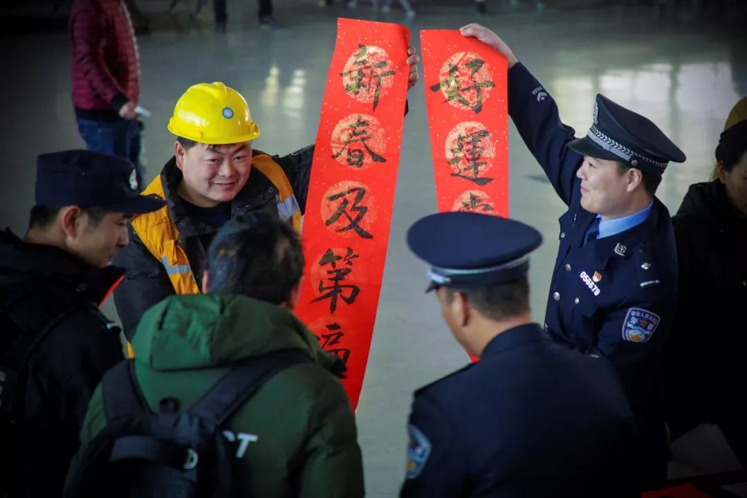 2019-01-21,河南省洛陽(yáng)市。為城市地鐵建設(shè)忙活一年的工人師傅也乘車(chē)回家過(guò)年,鐵路民警為其送上春聯(lián),希望他們新年越來(lái)越好。作者:陳國(guó)軍
