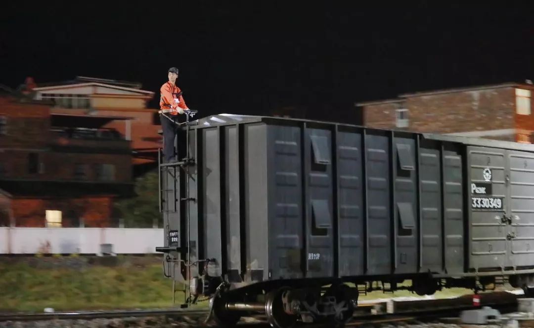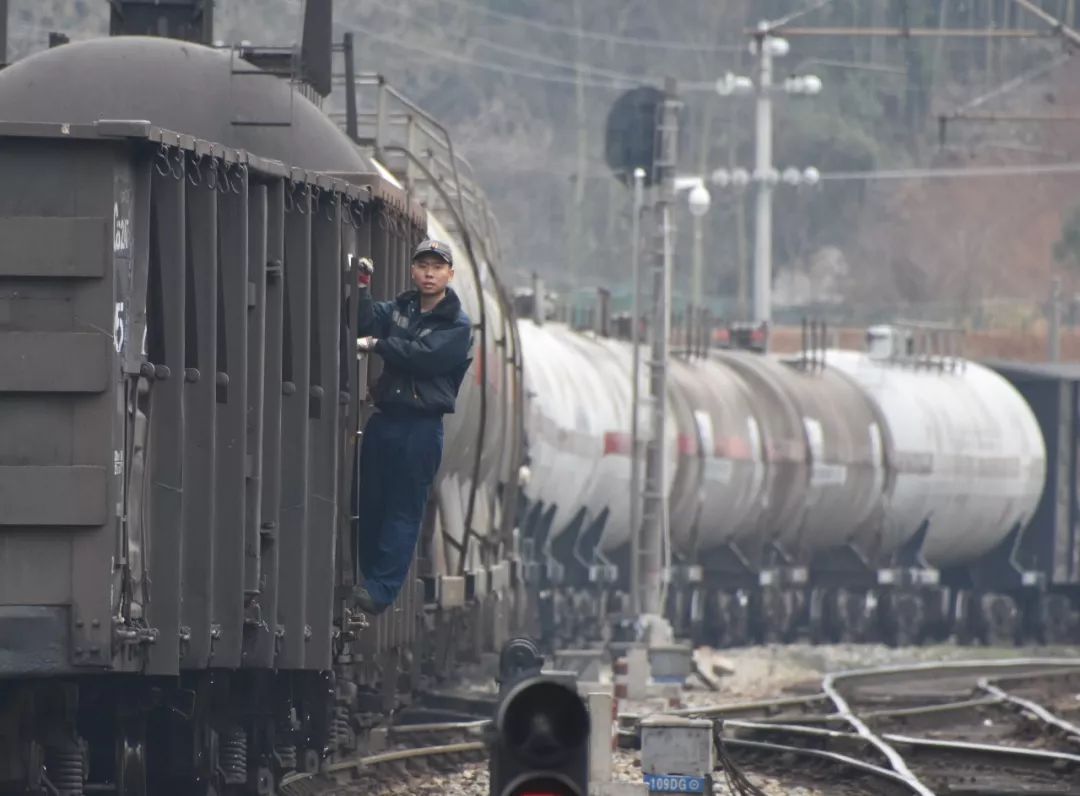 2019-02-02,長(zhǎng)沙車(chē)務(wù)段路口鋪車(chē)站。在搶運(yùn)航油、汽油等油品的專(zhuān)列上,連接員掛在車(chē)梯上編組列車(chē)。作者:麥子熟了