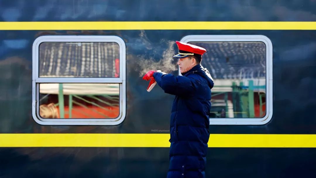 2019-01-31,吉林省白山市江源站。鐵路工作人員在發(fā)車(chē)前核對(duì)時(shí)間的瞬間。作者:了凡大叔