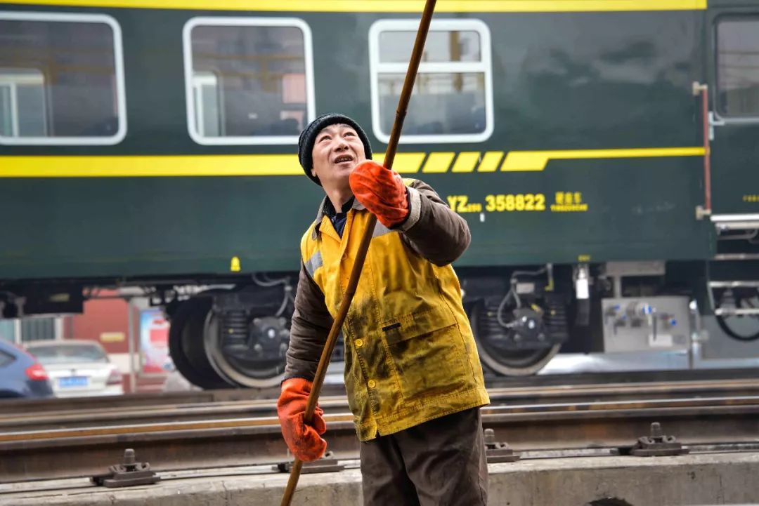 2019-02-01,河南鄭州火車(chē)站。“錘叔”鄭獻(xiàn)敏是鄭州車(chē)輛段的職工,38年來(lái),他忙碌于站臺(tái)上,穿梭于股道間,用一把小小的檢車(chē)錘確保著南來(lái)北往的旅客的乘車(chē)安全。作者:趙慶