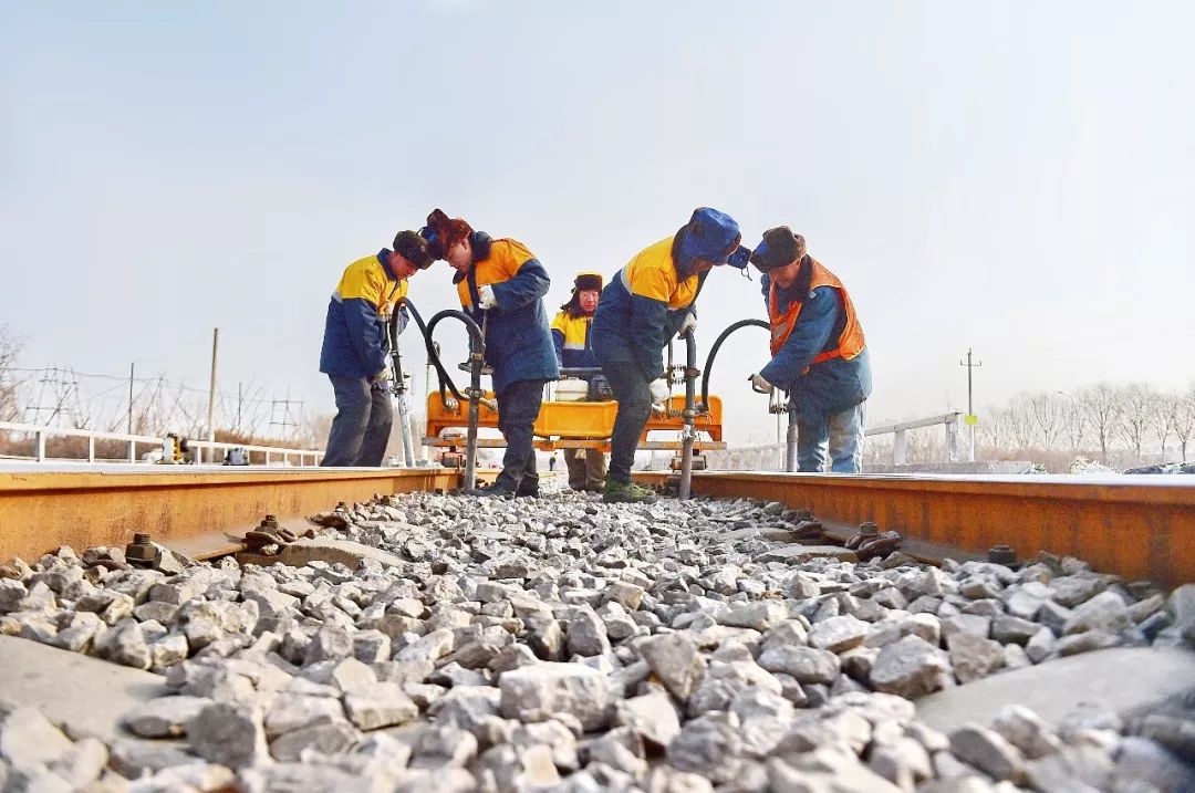 2019-02-06,河北省唐山市。北京局鐵路集團(tuán)公司所轄的七灤線(xiàn)上,工務(wù)工人正在搗固線(xiàn)路,確保春運(yùn)行車(chē)安全。作者:養(yǎng)路工