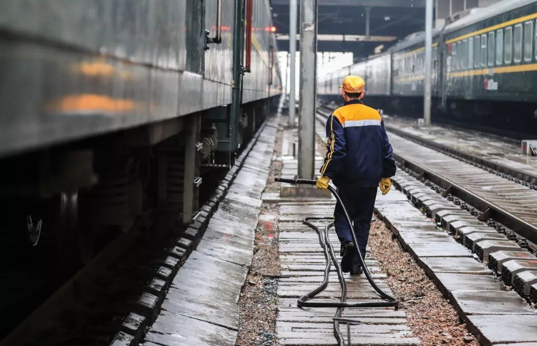 2019-01-11,天津。天津客運(yùn)段刷車(chē)工正在對(duì)車(chē)體進(jìn)行全面沖刷。作者:三生石
