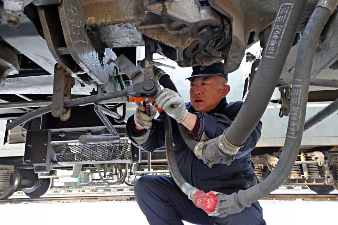 2019-02-08,唐山機(jī)務(wù)段。大年初四,唐山機(jī)務(wù)段的整備人員正在檢修機(jī)車(chē)走行部,確保出庫(kù)機(jī)車(chē)質(zhì)量良好。作者:樂(lè)亭閑人