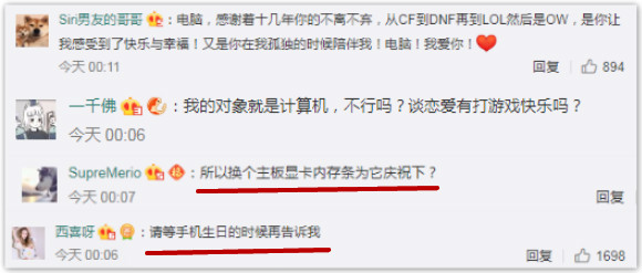 有網(wǎng)友表示,對廣大“單身狗”來說,平時陪伴自己時間最多,最了解自己的就是電腦了。因此,今天最重要的事就是為電腦慶祝生日。這條建議迅速得到其他網(wǎng)友的熱烈響應(yīng),網(wǎng)友“SupreMerio”提議,今天要為電腦更換主板顯卡和內(nèi)存條來慶祝。