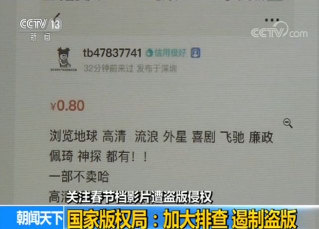 大年初一,多部不同類型和題材的國(guó)產(chǎn)影片集中上映,吸引了不少觀眾走進(jìn)影院。以電影《流浪地球》為例,憑借觀眾口碑,截至15日下午,該片票房已突破32億元,刷新了國(guó)產(chǎn)電影的多項(xiàng)票房紀(jì)錄。不過(guò)《流浪地球》上映沒(méi)幾天,該片的盜版資源就開(kāi)始通過(guò)微信朋友圈和微博等渠道在互聯(lián)網(wǎng)上傳播。甚至有人通過(guò)微商公然叫賣(mài)包含《流浪地球》在內(nèi)的多部院線影片的盜版資源,不僅聲稱畫(huà)質(zhì)“高清完整”,單部影片售價(jià)低至1元不到,打包購(gòu)買(mǎi)還能享受優(yōu)惠。