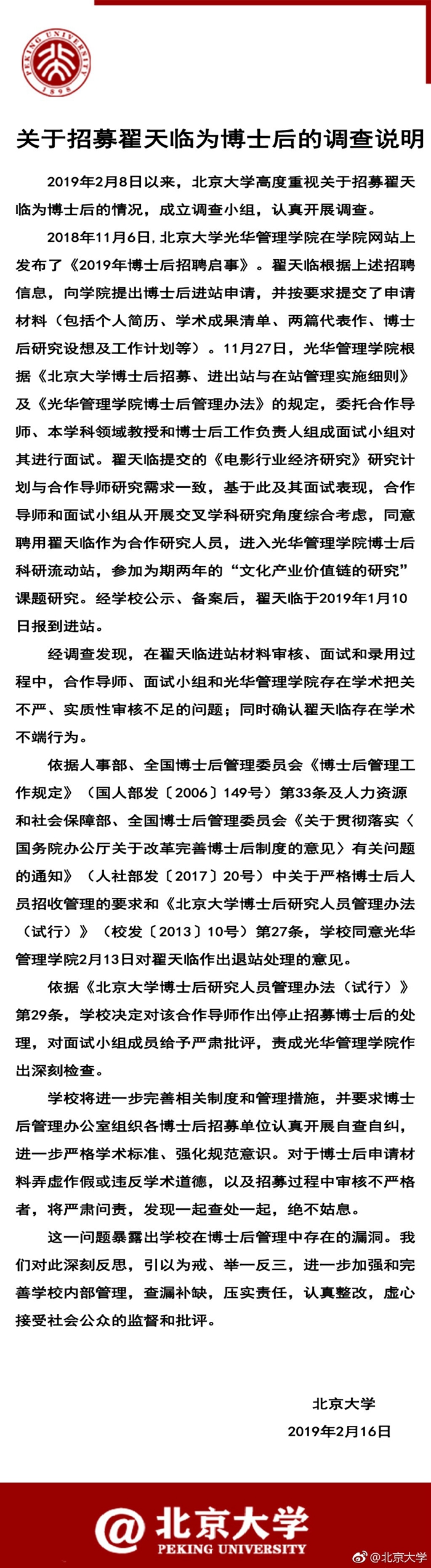 2月16日北京大學(xué)官方微博發(fā)布關(guān)于招募翟天臨為博士后的調(diào)查說明。