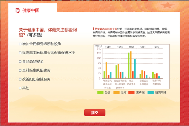 美好生活離不開健康,沒有全民健康,就沒有全面小康。在今年的兩會熱點(diǎn)調(diào)查中,健康中國引發(fā)網(wǎng)民普遍關(guān)注,排名靠前。