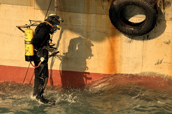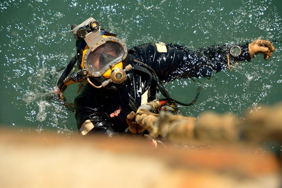 因?yàn)榻?jīng)常要在淤泥里探摸,潛水員在水底的移動(dòng)大多都是“爬”著完成。在韓國搜尋“世越號”沉船遇難者遺骨時(shí),潛水員就是爬著,把沉船方圓5海里的海底,每一寸都摸了一遍。