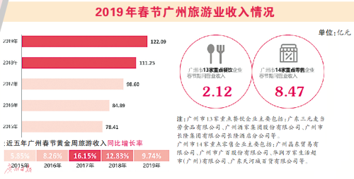 2019年春節(jié),廣州創(chuàng)下游客接待量和旅游業(yè)總收入“雙新高”,共接待旅客1696.27萬人次,較2018年同期增長8.66%,高于北京的811.70萬人次、上海的509.20萬人次,居一線城市首位,分別是北京的兩倍和上海的三倍;旅游業(yè)創(chuàng)收122億元,實(shí)現(xiàn)9.74%的增長,高于北京的81.85億元和上海的66.20億元,分別是北京的1.5倍和上海的1.8倍。