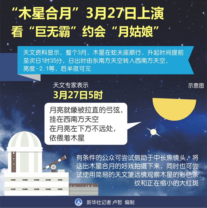 “有條件的公眾可嘗試借助于中長焦鏡頭,將這出木星合月的好戲拍攝下來,同時(shí)也可嘗試使用簡易的天文望遠(yuǎn)鏡觀察木星的彩色條紋和正在縮小的大紅斑?!壁w之珩提醒說。
