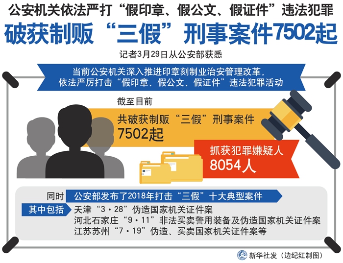 新華社北京3月29日電(記者丁小溪)記者29日從公安部獲悉,當前公安機關深入推進印章刻制業(yè)治安管理改革,依法嚴厲打擊“假印章、假公文、假證件”違法犯罪活動,截至目前,共破獲制販“三假”刑事案件7502起,抓獲犯罪嫌疑人8054人。