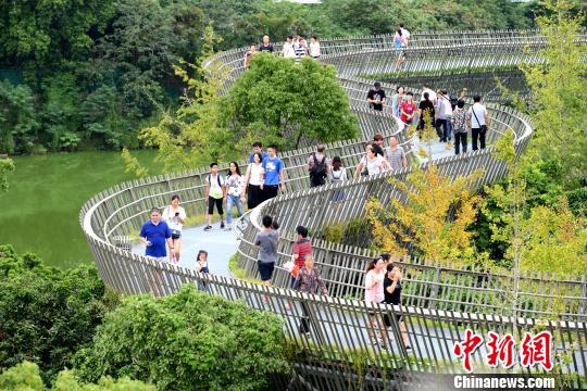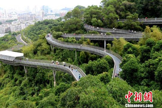 只要一有空,賴慶龍都要來逛“福道”,游山玩水、休閑健身兩不誤。“走‘福道’像是穿梭在山中,又沒有登山那么累?!辟噾c龍說,“福道”的設(shè)計很新穎,鏤空的棧道可以看到山的原貌,登到高處遠眺時還能看到自己的家。