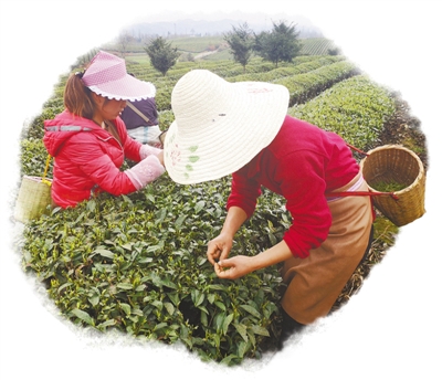 正值初春,茶海一股股綠色波浪間,采摘明前茶的身影漸漸多起來。走近些,只見茶農(nóng)兩手并用,上下翻騰,大拇指和食指準(zhǔn)確地將茶青捏住,用力一提,手腕一甩,鮮嫩的芽便收入了斜挎背的竹簍里。切不可用指甲掐,否則破壞了細(xì)胞結(jié)構(gòu),茶青是要變黑的。
