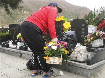 然而記者在園中發(fā)現(xiàn)了奇怪的身影。在一處偏僻的角落里,一名騎三輪車的男子一直默默觀望著。待祭掃者離開后,他騎車來到墓前,迅速收走剛擺上的花束,隨后匆匆離去。