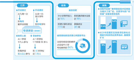 然而,要充分發(fā)揮教育信息化的優(yōu)勢(shì),還需實(shí)現(xiàn)信息化手段從“用起來(lái)”到“用得好”轉(zhuǎn)變。這就需要依靠培訓(xùn),使教育管理部門(mén)和一線(xiàn)師生的信息化素養(yǎng)同步提升。 湖南多地實(shí)行四級(jí)培訓(xùn)制度:通過(guò)“國(guó)培計(jì)劃”等,培訓(xùn)中小學(xué)校長(zhǎng)及教育主管部門(mén)人員;通過(guò)湖南省中小學(xué)教師信息技術(shù)應(yīng)用能力提升工程,培訓(xùn)信息技術(shù)骨干教師和專(zhuān)任骨干教師;通過(guò)組織電化教育館及高校等單位的專(zhuān)家學(xué)者赴基層,培訓(xùn)教育信息化基礎(chǔ)教師;培育出來(lái)的“種子教師”,為所在學(xué)校的科任教師普及教育信息化知識(shí)。