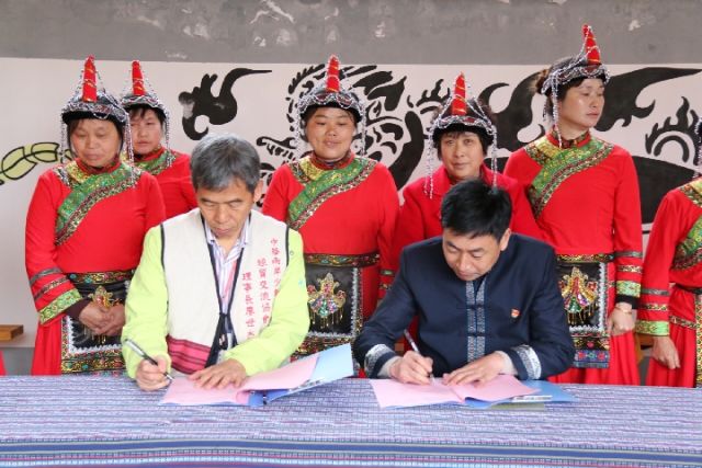 太源畬族鄉(xiāng)鄉(xiāng)長雷諄身(右)與中華兩岸少數(shù)民族文化經(jīng)貿(mào)交流協(xié)會(huì)理事長廖世杰簽署兩岸少數(shù)民族交流合作備忘錄現(xiàn)場。(李娜 攝)