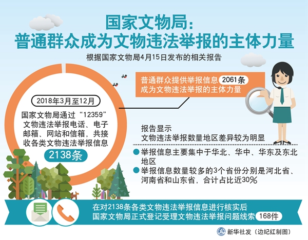 新華社北京4月15日電(記者施雨岑)根據(jù)國家文物局15日發(fā)布的相關報告,2018年3月至12月,國家文物局通過“12359”文物違法舉報電話、電子郵箱、網(wǎng)站和信箱,共接收各類文物違法舉報信息2138條。普通群眾提供舉報信息2061條,成為文物違法舉報的主體力量。
