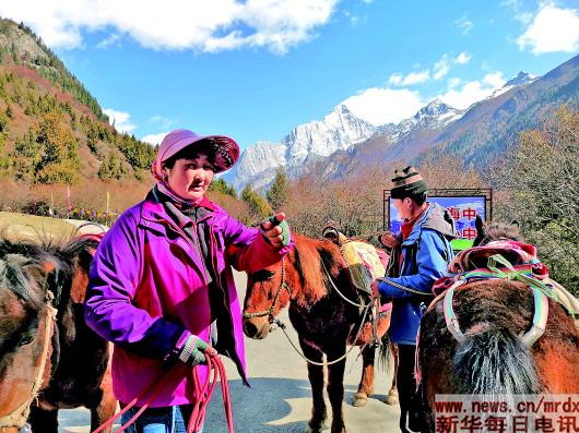 有“東方阿爾卑斯山”之稱的四姑娘山,位于四川阿壩藏族羌族自治州小金縣境內(nèi),與“大熊貓的故鄉(xiāng)”——臥龍自然保護(hù)區(qū)接壤。由于生態(tài)環(huán)境保護(hù)的特殊性,不少觀光地點(diǎn)車輛無法進(jìn)入,只能徒步穿越或者騎馬進(jìn)山,馬匹具有十分重要地位?!耙婚_始,我一個(gè)人牽馬,沒有統(tǒng)一的組織和管理,一天有時(shí)候只能掙三四十元,有的游客還擔(dān)心是否安全,不敢坐?!痹鞲嬖V記者,村里統(tǒng)一管理以后,村民接受了專業(yè)培訓(xùn)、收費(fèi)透明,選擇坐馬穿越長坪溝和海子溝的游客越來越多。如今,長坪村有牽馬師700余人,牽馬成為村民重要的收入來源。