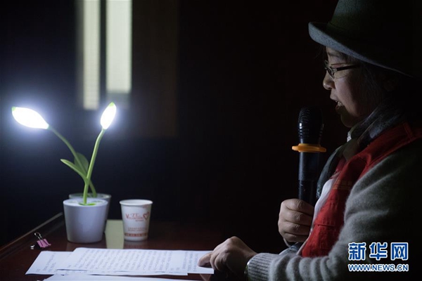 又到一次電影放映的日子。吳素環(huán)坐在放映室靠近屏幕的一個(gè)角落,右手握著話筒、左手撐在下方,在一個(gè)多小時(shí)的電影播放過程中,保持住話筒不搖晃。在微弱的臺(tái)燈燈光下,她時(shí)而抑揚(yáng)頓挫地讀著解說稿,時(shí)而抬起頭看看放映屏幕。