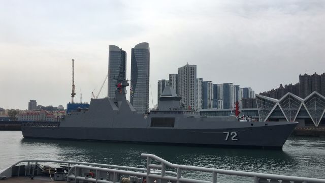 19日10時(shí)許,新加坡海軍“堅(jiān)強(qiáng)”號(hào)護(hù)衛(wèi)艦緩緩駛?cè)肭鄭u大港碼頭。這是參加中國(guó)人民解放軍海軍成立70周年多國(guó)海軍活動(dòng)到訪的第一艘外國(guó)海軍艦艇。新華社記者梅世雄 攝