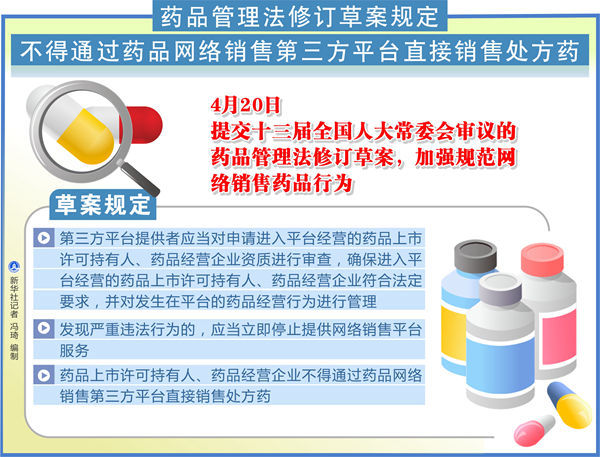 新華社北京4月20日電(記者趙文君)20日提交十三屆全國人大常委會審議的藥品管理法修訂草案,加強規(guī)范網(wǎng)絡銷售藥品行為,明確不得通過藥品網(wǎng)絡銷售第三方平臺直接銷售處方藥。
