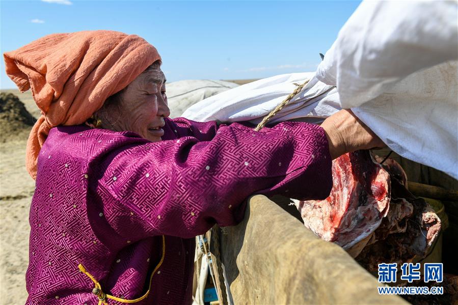 內(nèi)蒙古自治區(qū)新巴爾虎左旗甘珠爾蘇木伊和呼熱嘎查牧民斯布格道爾吉從勒勒車上取出風(fēng)干羊肉,為家人和羊倌準(zhǔn)備午飯(4月10日攝)。新華社記者 彭源 攝
