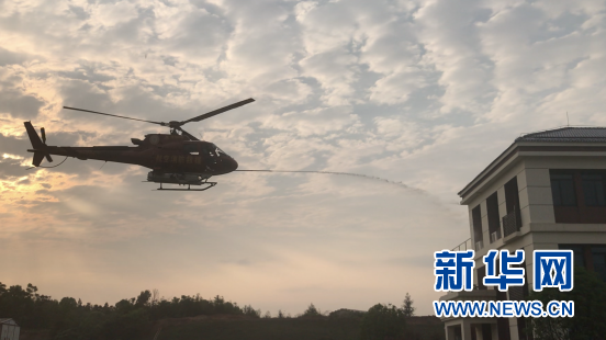 圖為消防直升機(jī)對(duì)著火建筑進(jìn)行滅火水劑噴射。新華網(wǎng) 黃浩攝