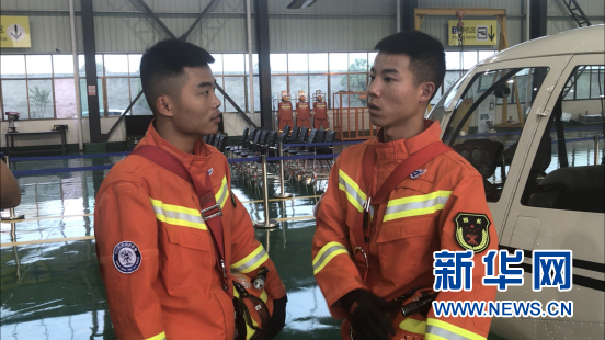圖為消防員(左唐運(yùn)德,右李金地)進(jìn)行演練后經(jīng)驗(yàn)交流。新華網(wǎng) 黃浩 攝