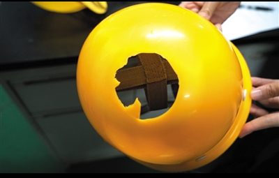 15元安全帽測(cè)試后現(xiàn)破洞。新京報(bào)記者 唐躍 攝